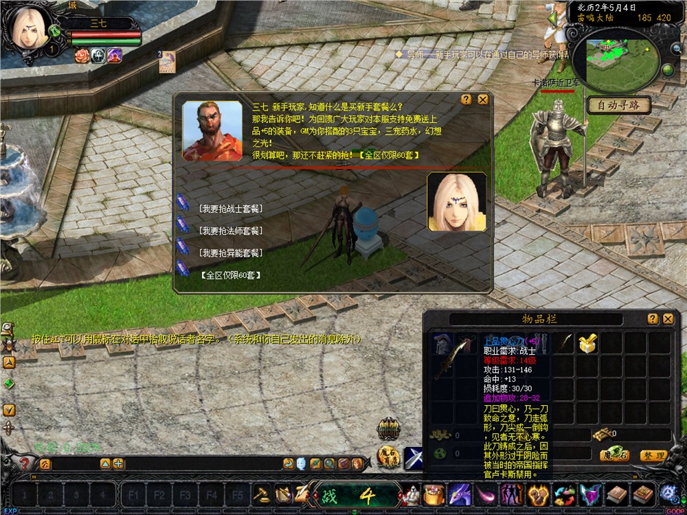 1、新手点领取新手套餐礼包,礼包含装备 三宠药水等惊喜物品;