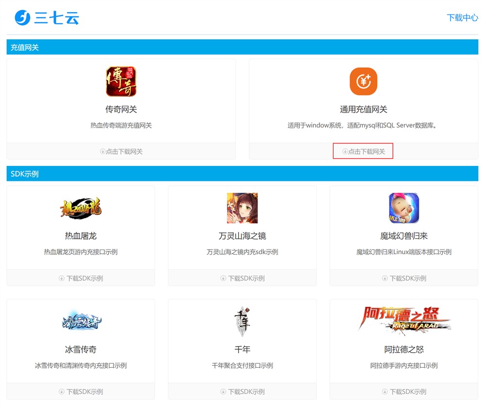 2、然后,点击三七云菜单进入“SDK和网关”下载页面,下载“通用充值网关”;