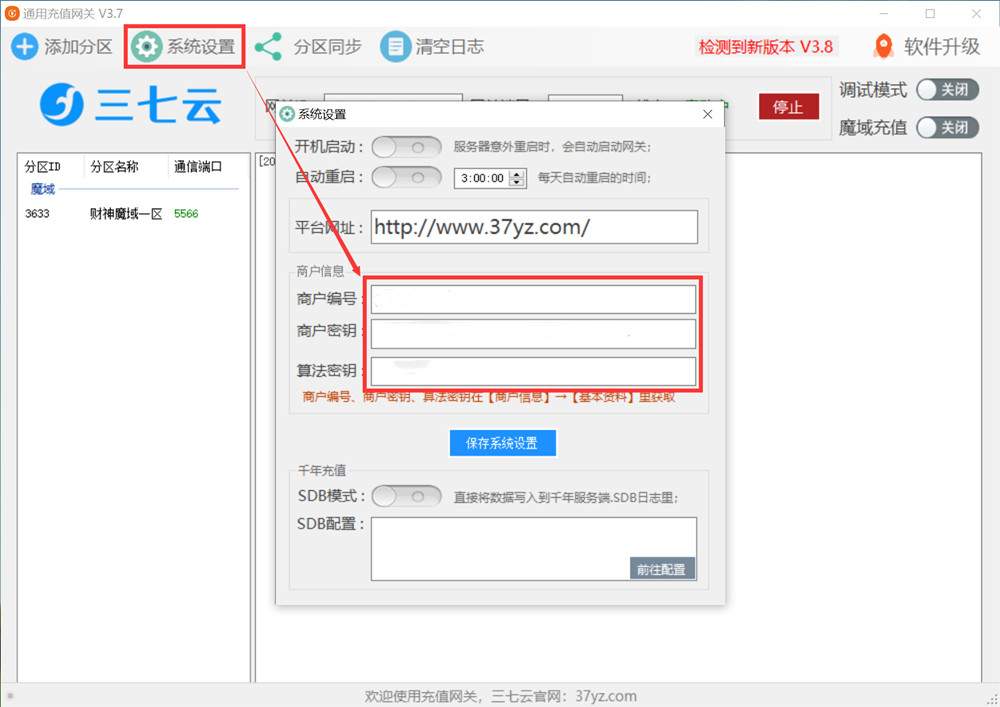 2、将刚才下载好的网关上传到服务器 D盘并解压,双击运行充值网关.exe,点击“系统设置” → 填写商户编号、商户密钥、算法密钥;