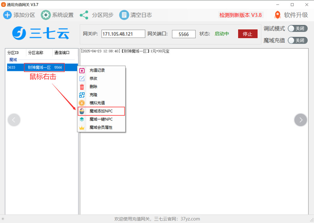 5、分区添加好之后,在网关左侧列表的分区上鼠标右键菜单,点击“魔域添加NPC”,然后重启游戏服务端;