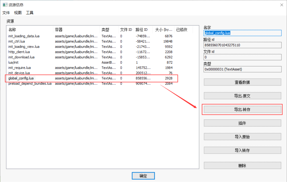 3、在资源里找到global_config.lua,点击右侧的“导出.转存”,保存到电脑桌面上