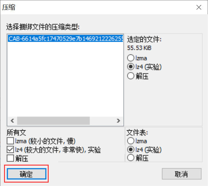 7、“文件” → “压缩”,选择刚才保存的那个名称为“2 ”的文件,全部默认,点击“确定”,文件名输入最原始要修改的那个文件名称即可。