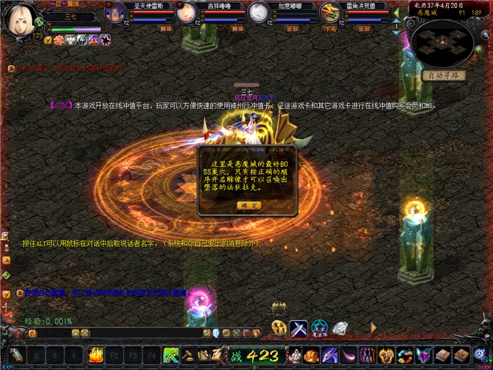 三号BOSS[炎魔督军,15分钟刷新一次]暴:元素宝石、金元宝、25星XO、2700点魔石卡、阳光包、神力经验值球、等大量财宝;