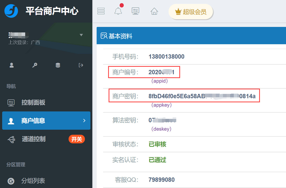 2、支付平台【商户中心】→【商户信息】→【基本资料】,复制商户编号和商户密钥