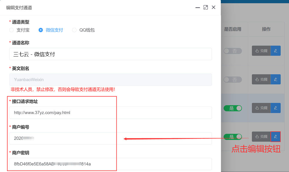 阿拉德后台 → 支付通道 → 修改【三七云】通道的接口请求地址、商户编号和商户密钥
