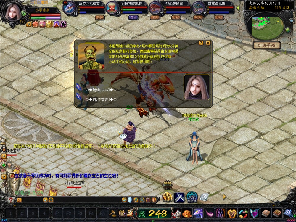 【团战】 新区开区第三天晚上21:00开始团战,老区每晚21:00举行团战,奖励三宠药水和神之祝福各一个(或者1000点魔石,可任选其一);