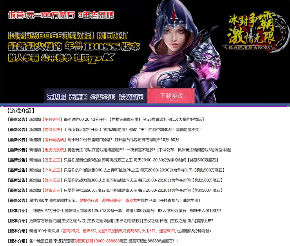 10、上线送VIP7,打开新手包获得人物等级125,+12装备一套,赠送5000万魔石,BOOS入包30万魔石,蜘蛛王入包100万;