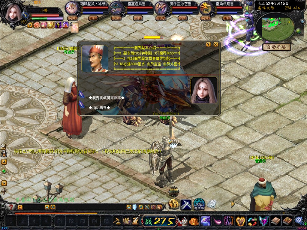 16、【圣光之石】雷鸣门口可提交圣光之石,上交到20个自动召唤剑魔,打死入包300万爆500星水和珍贵物品 ;